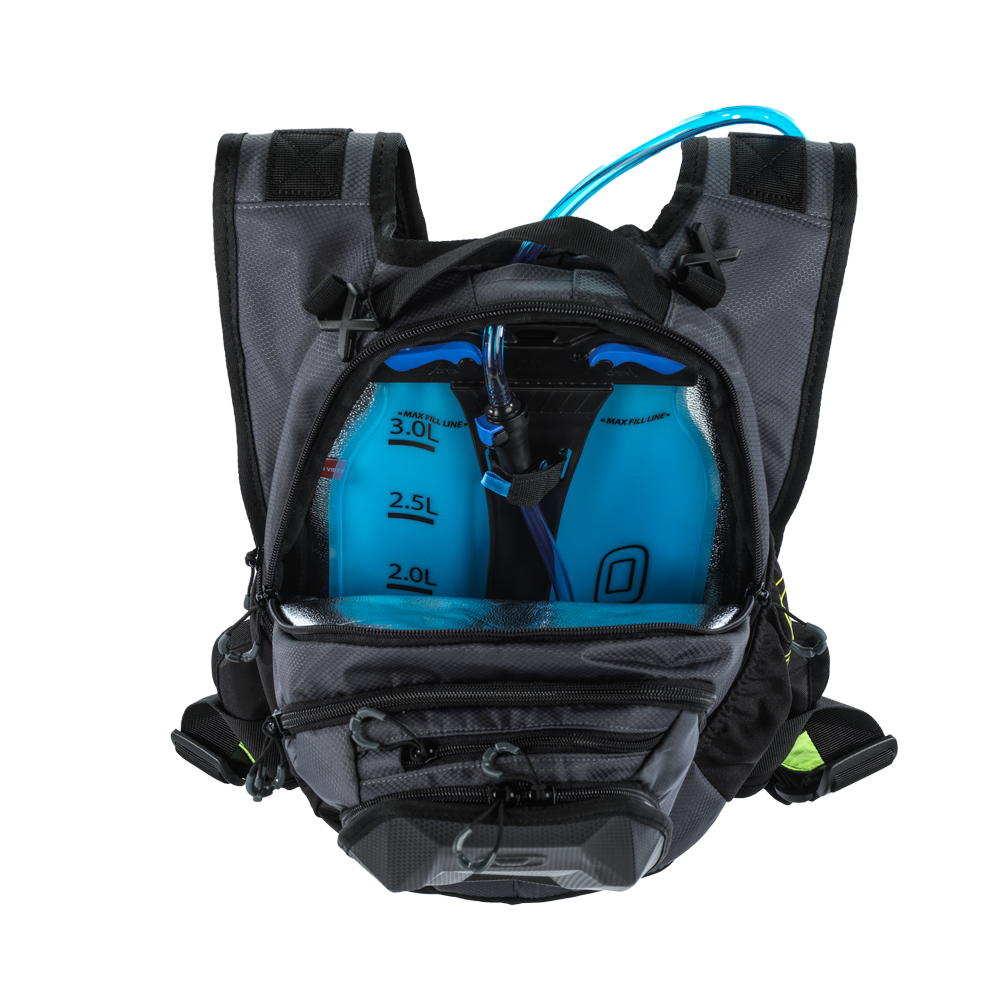 • Dedicated Anti-Sloshing hydration bladder compartment with hook & loop secure strap for holding bladder in place and tube channel port