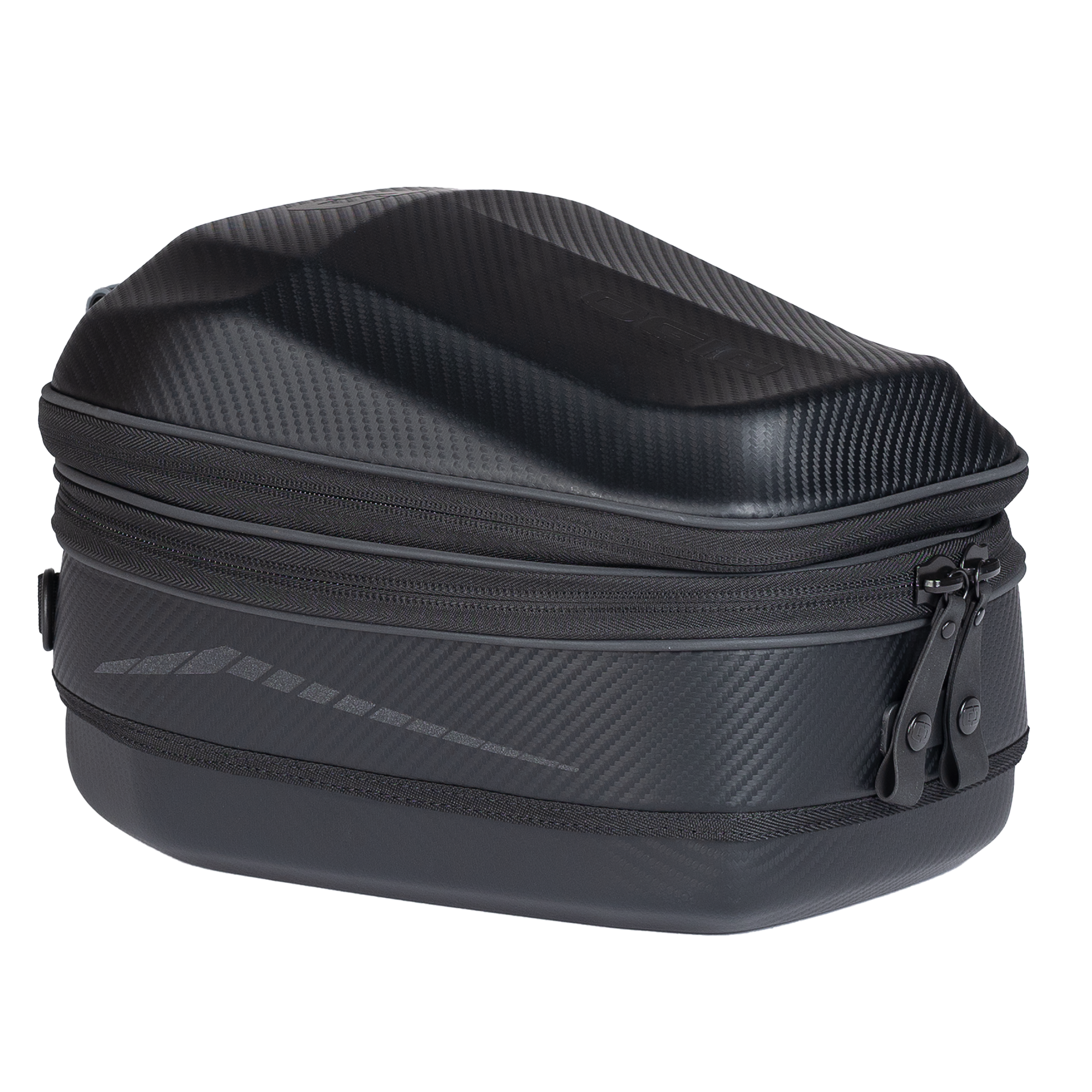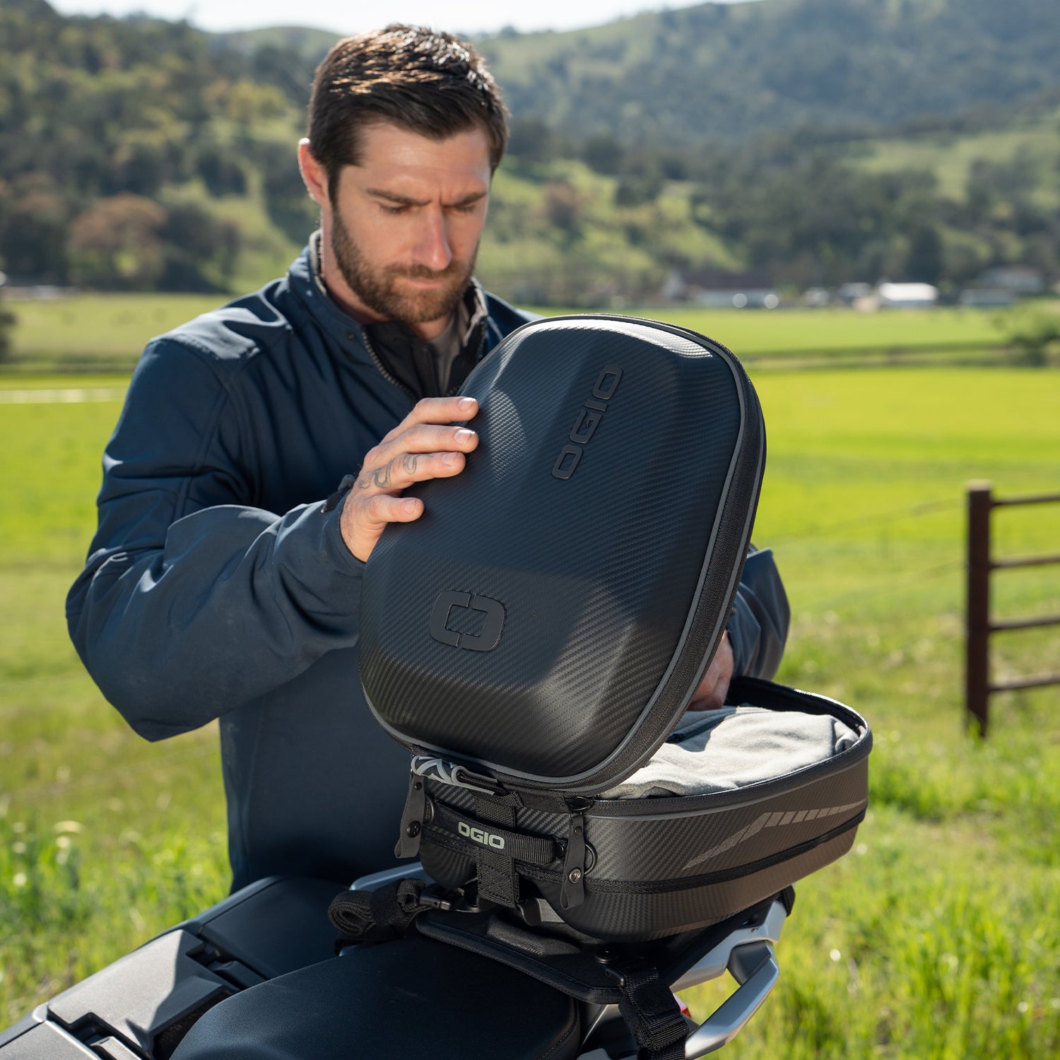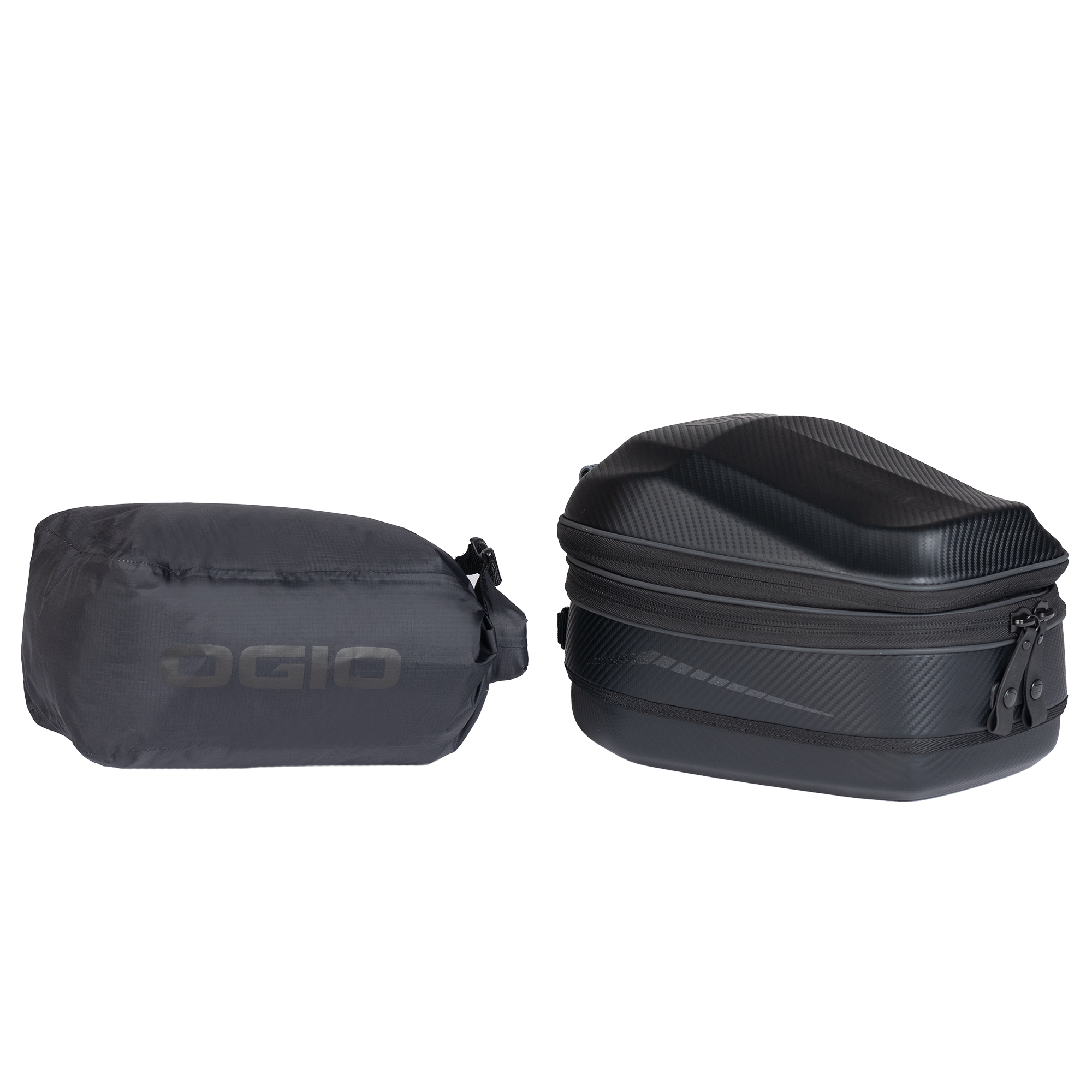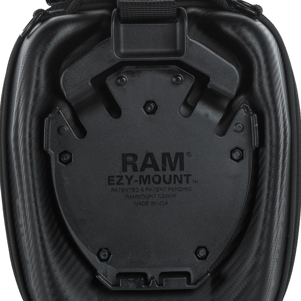 The TB2 is a 21L Tail Bag with a 3” expansion joint that allows the bag to expand and store up to 28L of volume. The Molded EVA with Carbon Fiber PU film provides structure and support while providing water resistance from the elements. The unique design is low-profile and provides an internal storage pocket, waterproof rolltop liner and carry strap. The RAM® EZY-Mount™ partnership with OGIO created a patent pending system that makes it easy to install, easy to use and easy to take-off when the ride is over.