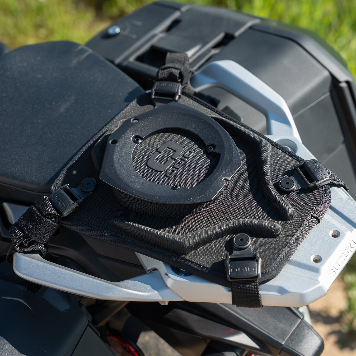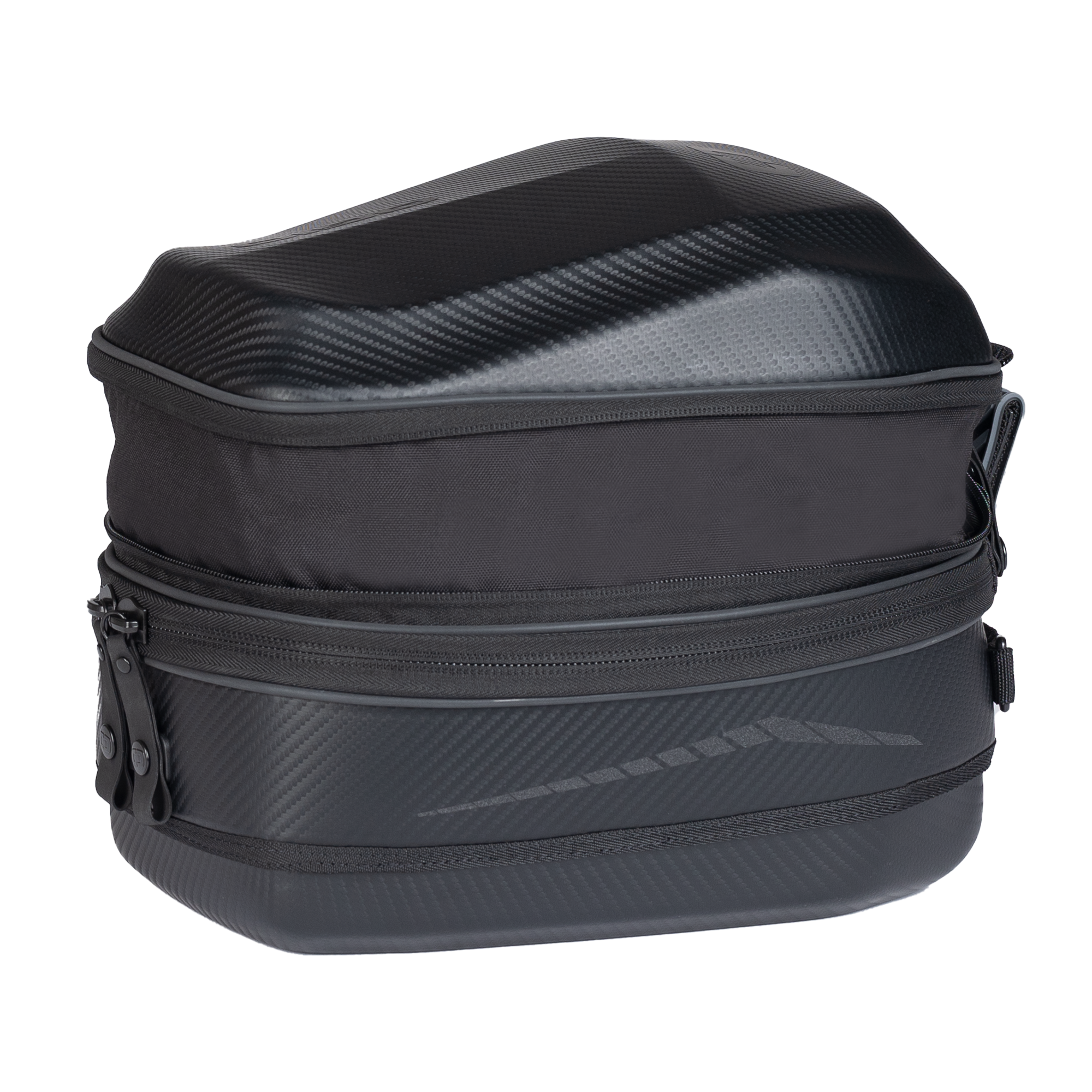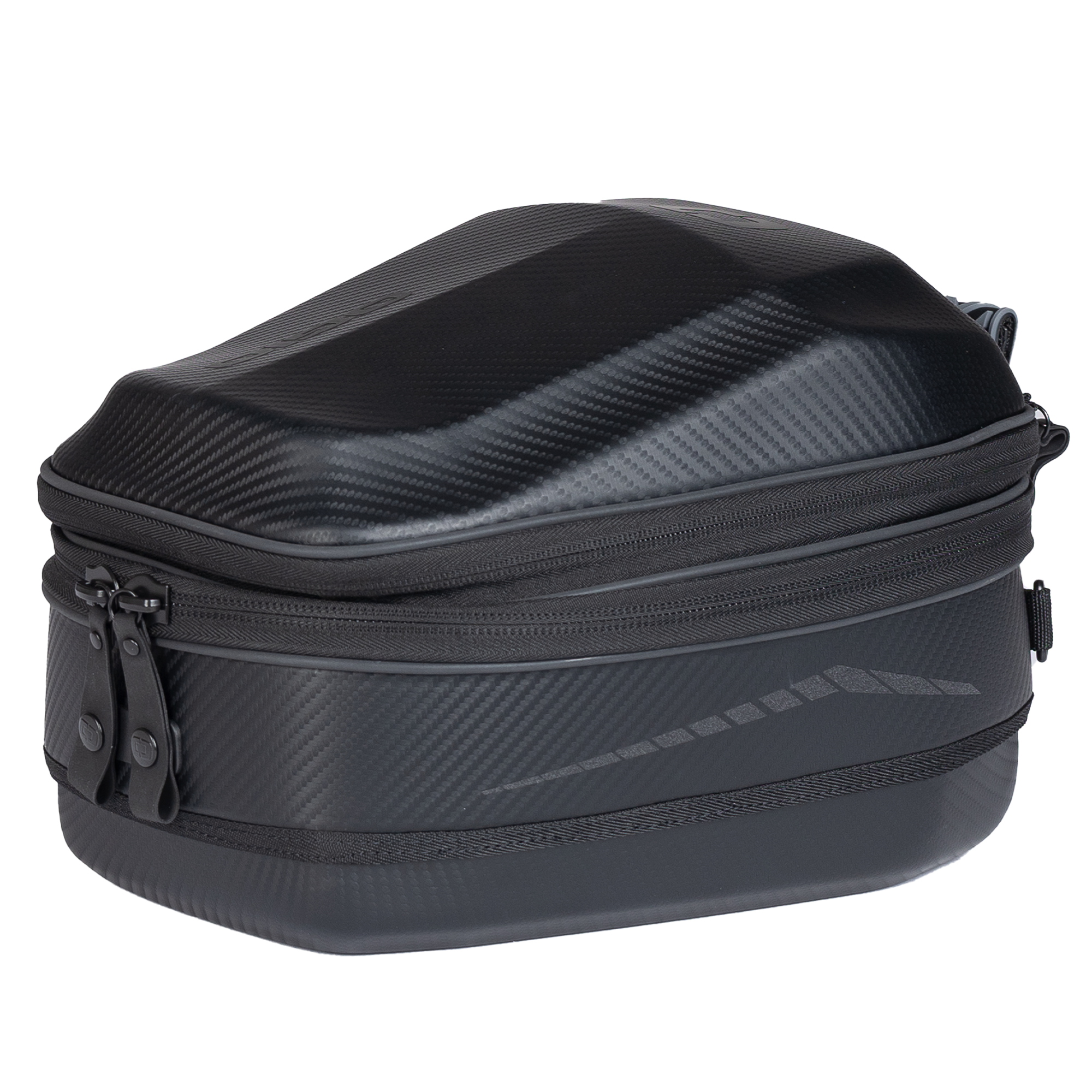 The TB2 is a 21L Tail Bag with a 3” expansion joint that allows the bag to expand and store up to 28L of volume. The Molded EVA with Carbon Fiber PU film provides structure and support while providing water resistance from the elements. The unique design is low-profile and provides an internal storage pocket, waterproof rolltop liner and carry strap. The RAM® EZY-Mount™ partnership with OGIO created a patent pending system that makes it easy to install, easy to use and easy to take-off when the ride is over.